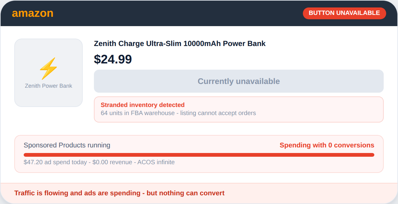 PPC campaigns running against Add to Cart-suppressed listings generate clicks and spend with zero conversion - a loss that compounds hourly and is invisible in standard conversion reports until an ad performance anomaly is investigated manually.