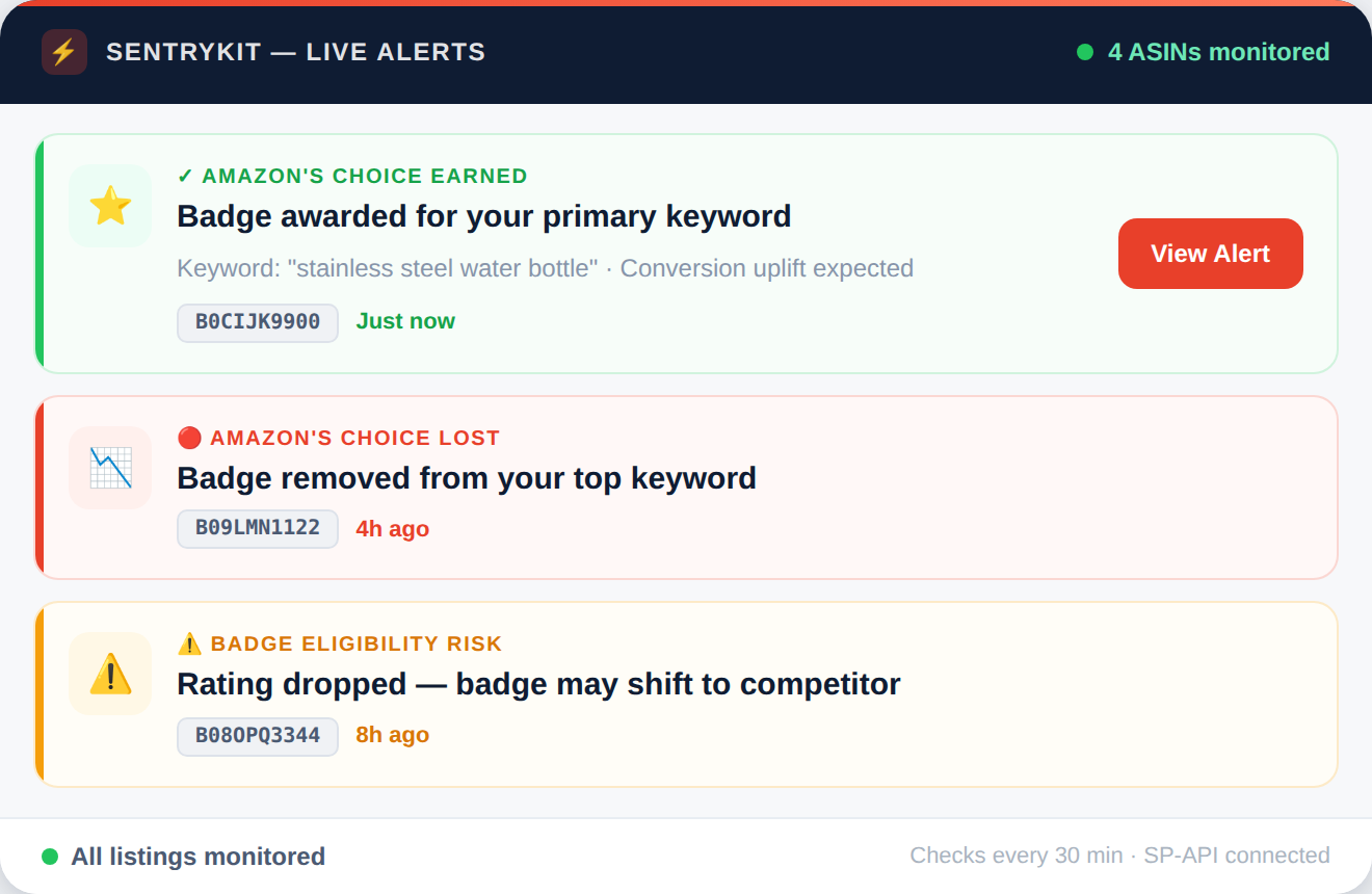 SentryKit connects to your Amazon account via SP-API and monitors Amazon's Choice badge status on every tracked ASIN. When the badge is gained or lost on any keyword or category context, you receive an email alert within 30 minutes with the ASIN, keyword context, and timestamp. Amazon's Choice badge status is a real-time performance signal tied to keyword relevance, conversion rate, pricing, and reviews. SentryKit surfaces badge changes immediately so sellers can act on gains and investigate losses before they affect revenue.