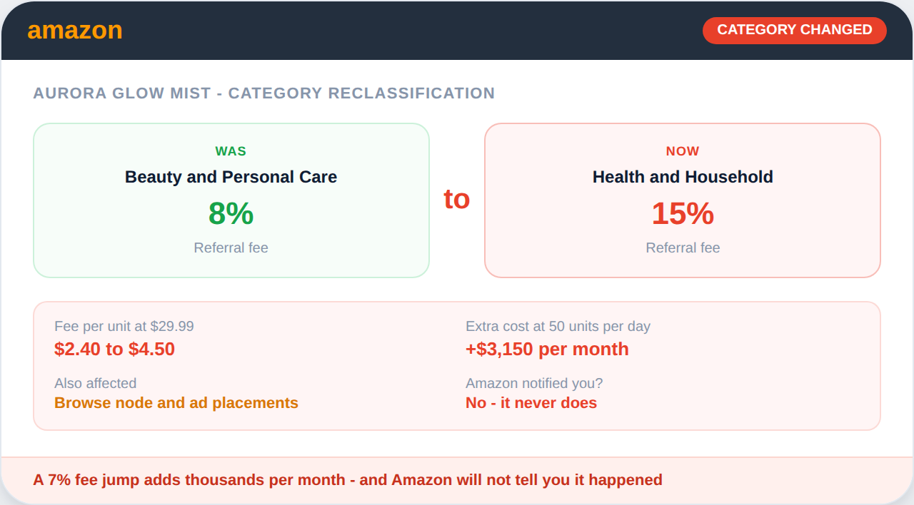 After a category reclassification is detected, immediately check whether your referral fee rate or FBA fee tier changed as a result. Recalculate margins at the new rates. Also verify whether the reclassification affected any program eligibility such as removal from Amazon's Choice consideration or Subscribe and Save availability.