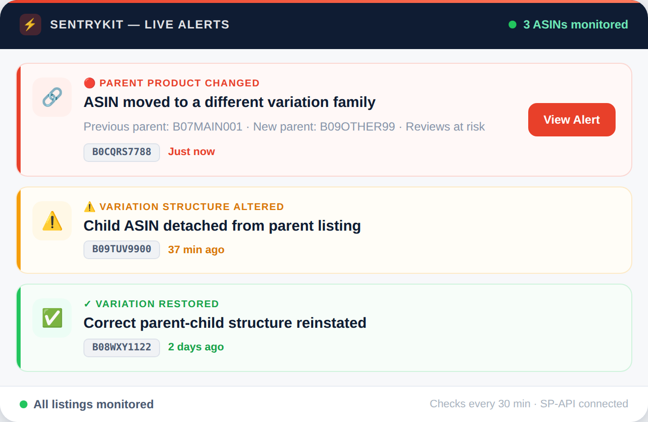 SentryKit monitors ASIN parent-child associations continuously on every tracked listing. When a relationship changes, an alert arrives within 30 minutes - giving you the window to begin catalog repair before buyers see an orphaned listing with zero reviews.