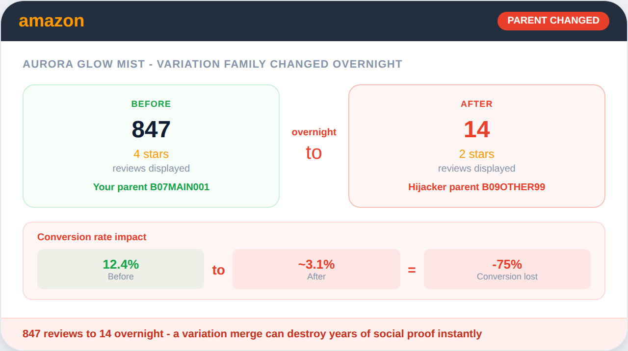 A severed parent-child relationship on a 3-variation listing can appear to buyers as three brand-new products with zero reviews - eliminating the social proof that drove the product's original conversion rate entirely.