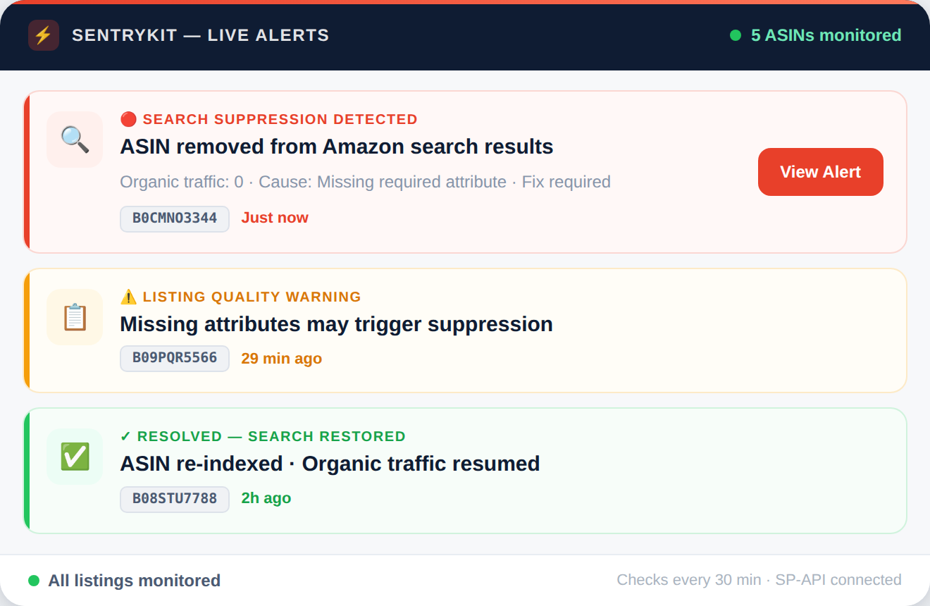 SentryKit connects to your Amazon account via SP-API and monitors the search index status of every tracked ASIN. When a listing is suppressed from search results, you receive an email alert within 30 minutes - including the ASIN, suppression type where available, and the event timestamp. Search suppression is one of the most damaging and least visible listing issues sellers face. SentryKit's logging also confirms re-indexing events, so you know the moment your listing is restored to search visibility after a fix is applied.