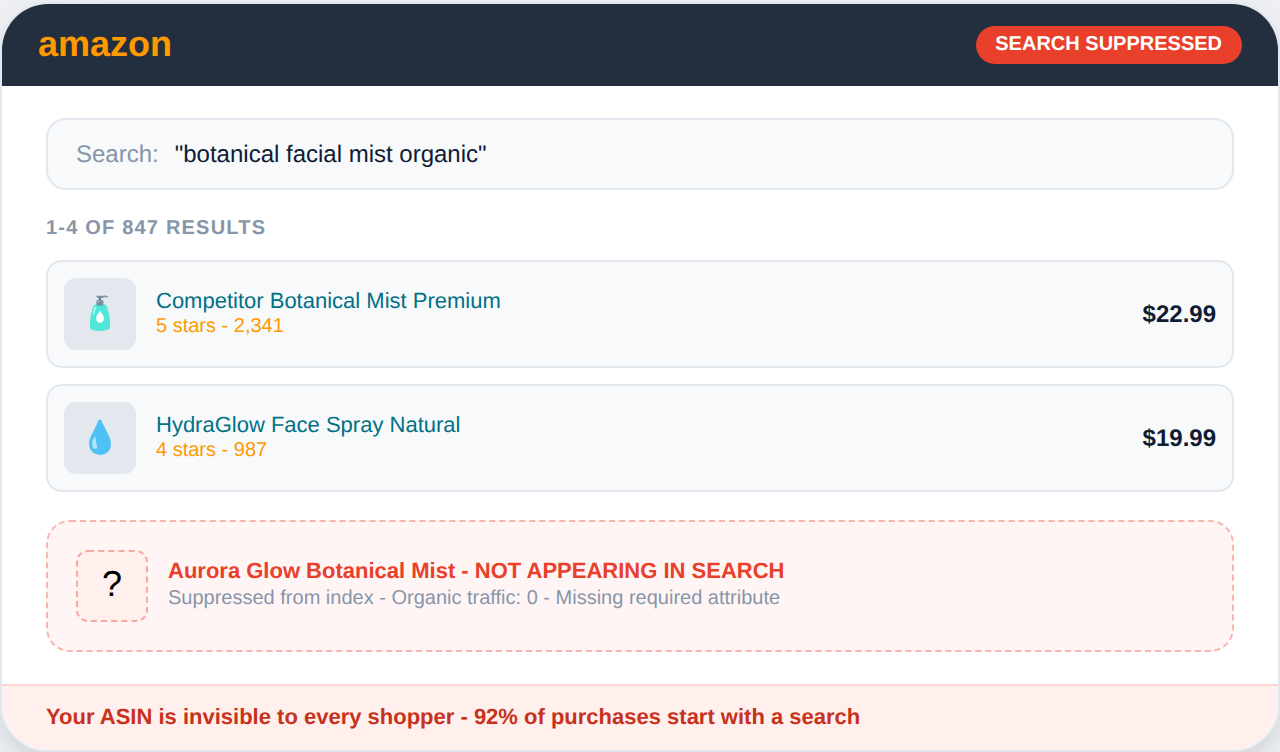 of organic traffic to a search-suppressed listing drops to zero immediately - with no sales, no ranking signal, and no Amazon notification to the seller